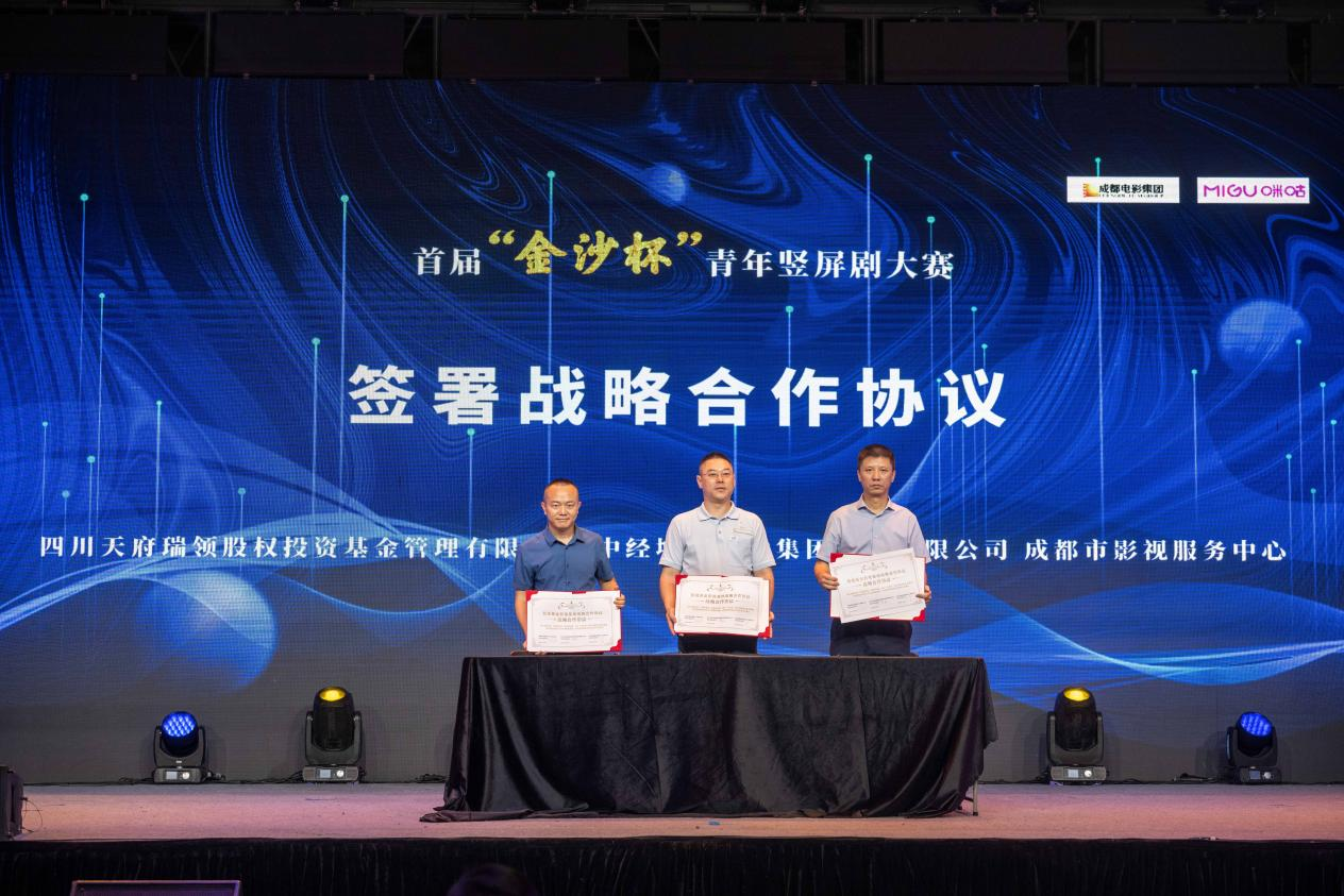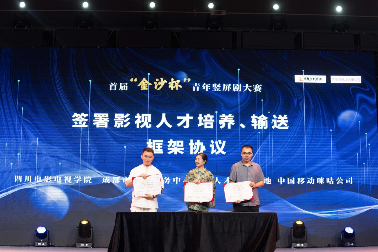 中國移動咪咕公司咕咕工作室短劇制片人黃振民 (左)、四川電影電視學院黨委副書記、副校長羅思(中)、成都市影視服務(wù)中心人才孵化基地負責人張易(右)簽署影視人才培養(yǎng)、輸送框架合作協(xié)議